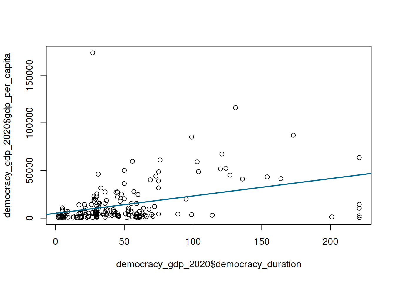 lm(formula = gdp_per_capita ~ democracy_duration, data = democracy_gdp_2020)
