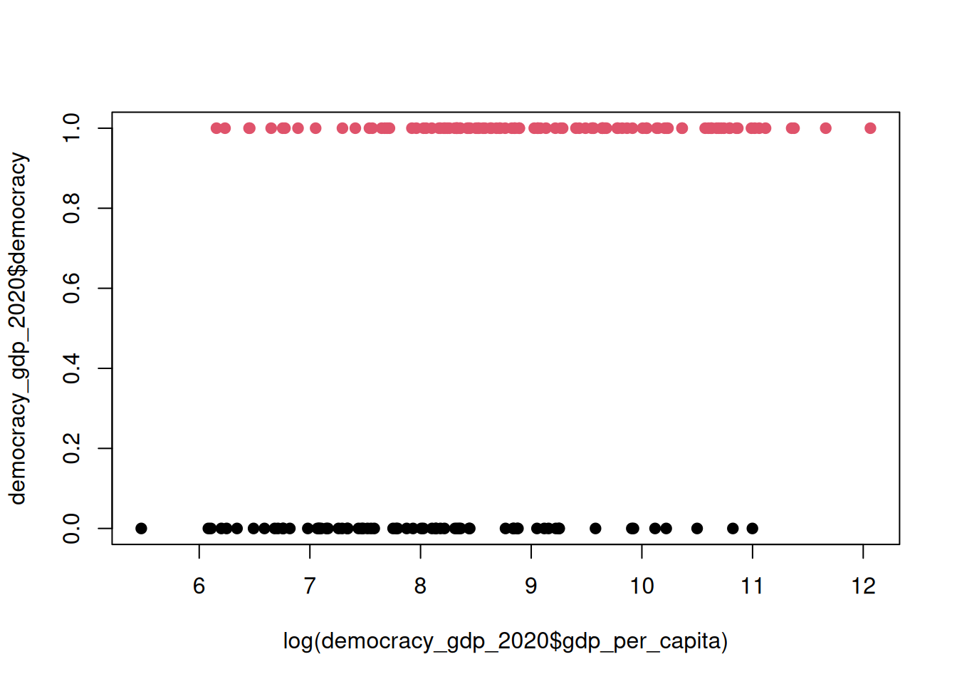 col = democracy_gdp_2020$democracy + 1 # Add 1 to avoid white colour